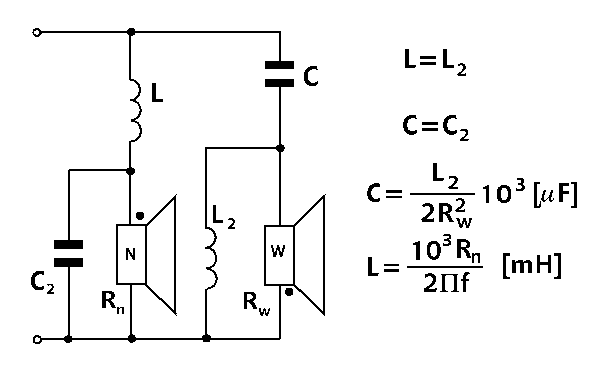 Filtr taki jest często stosowany i daje dobre efekty w zespołach małej i średniej mocy. Stosując dwa głośniki o jednakowej efektywności ustala się częstotliwość podziału "f" i oblicza obie gałęzie układu. Wówczas moc przenoszona przez filtr powinna być teoretycznie stała, ponieważ przy częstotliwości podziału f napięcie na każdym z głośników maleje o 3 dB co oznacza, że moc pobierana przez głośnik wynosi 50% mocy w paśmie przepustowym. Należy dodać, że obydwa głośniki powinny mieć jak najbardziej zbliżoną efektywność i jednakową rezystancję cewki.